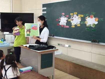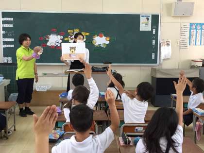 1年生の教室に栄養教諭を招いて、食べ物の学習をしました。