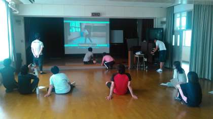 6月26日(火)先々週に本校教職員による、入水前の準備運動の研修の様子です。学年が違っても、同じ準備体操ができるようにしています。