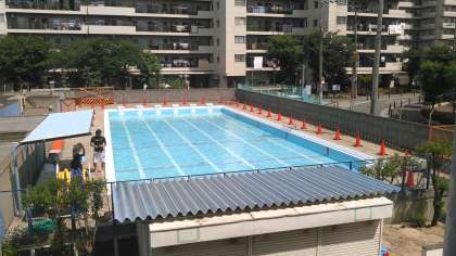 8日間延期していましたプール水泳ですが、ブロック塀の2面は使用せずに実施します。