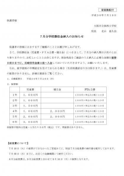 7月分学校徴収金納入のお知らせ