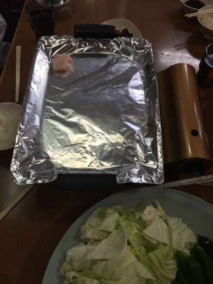 焼き肉を自分たちで焼いて食べ始めました。鉄板に乗せる順番や役割を話し合っています。