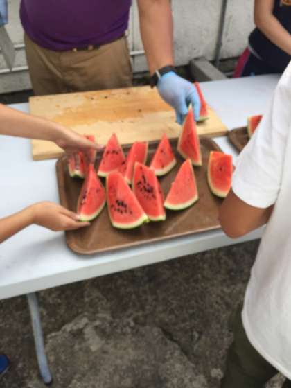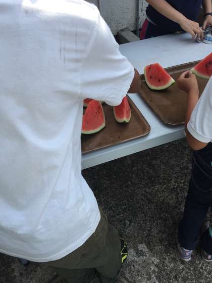 おやつのスイカを切っていただきました。いただきます。