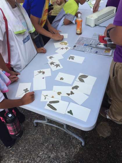 新聞紙の下に花を入れてアイロンをかけて、ラミネーターで葉書と一緒にプレスしています。