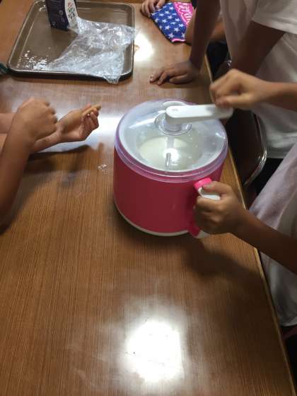アイスクリームづくりが初めての子もやったことがある子も力を合わせて作業をしています。