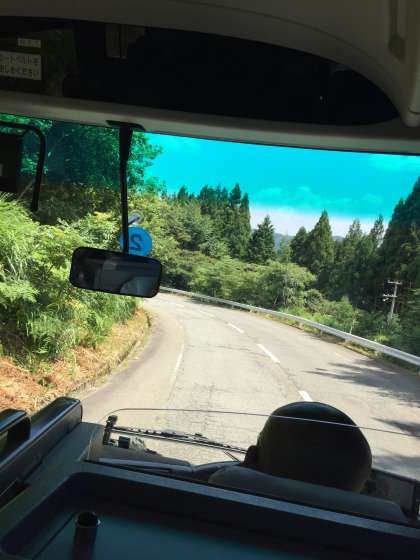 空と雲と木々の美しさを感じながら、バスに揺られて山を下っています。