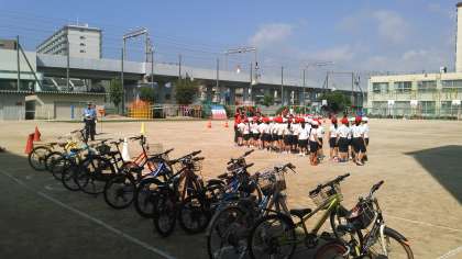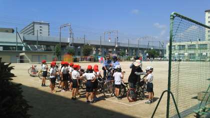 8月29日(水)今日の午前中に交通安全教室を行いました。西淀川警察署と区役所の協力で開催しています。猛暑のため、日陰で話を聞いた後にコースを回りました。