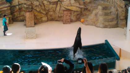 イルカではなくアシカショーでした。オレンジのボールめがけて一生懸命ジャンプしていました。