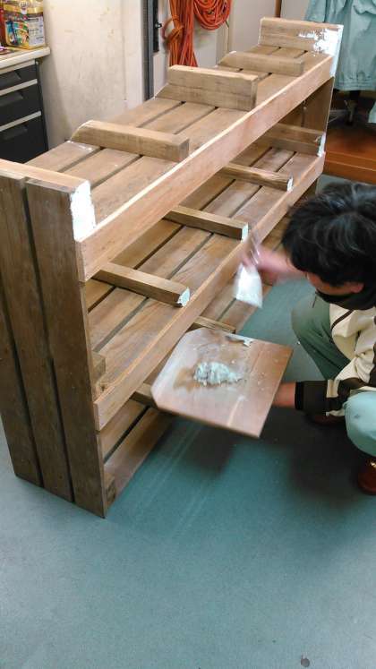 12月14日(金)今週は、懇談会にご出席いただきありがとうございます。管理作業員さんは、校内で不要になった廃材などを使って靴箱を制作しています。表面の凹凸をパテ埋めして、ペイントすれば新品に見えるようにしています。また、一つ学校の財産が増えました。