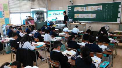 写真は、授業研究のために行った授業の様子です。先生も児童も一生懸命思考力を働かせていました。