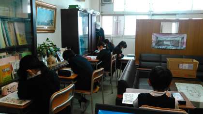 写真は、校長室で英検Jrに挑戦している3・4年生の様子です。