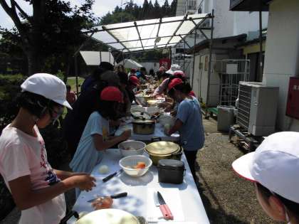 飯盒炊爨が始まりました。普段は自分で料理をしたりすることが少ない子どもたち。林間では、IHやガスコンロはありません。フードプロセッサーもないため、分担してカレーをつくっています。