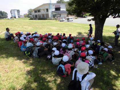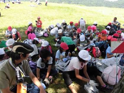 焼板工作の様子です。杉の板を焼き、表面についた真っ黒な炭を取り除くときれいな木目が浮かび上がります。そのあと、油性のペイントで着色し出来上がり。高原の日陰で気持ちよく制作していました。