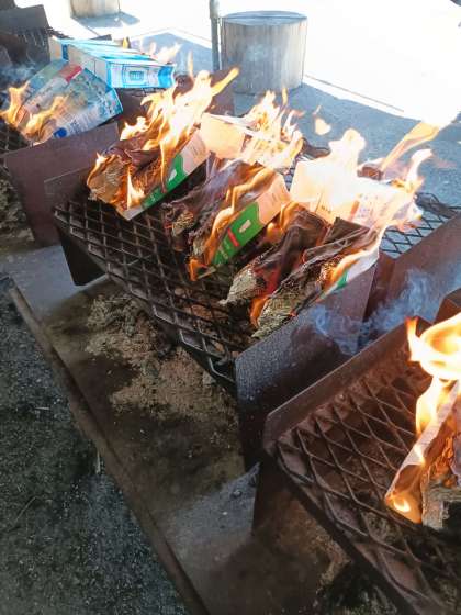 バーナーで火をつけてもらい、パックを焼いてもらいます。