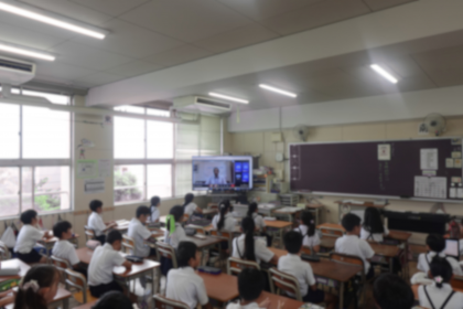 教室前方にある大きなディスプレイに映される校長先生や生活指導の先生方の話をしっかりと見聞きしていました。