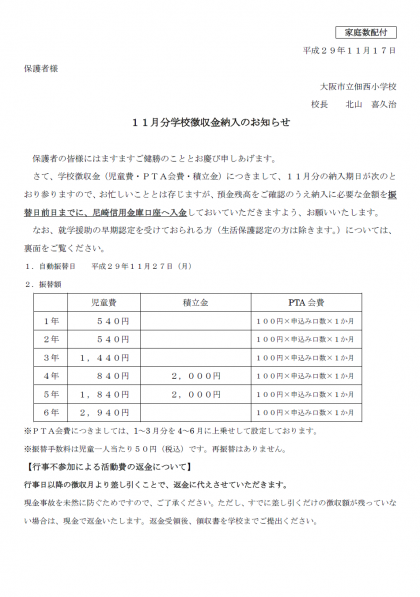 本日、お子さまを通じて「11月分学校徴収金納入のお知らせ」を保護者の皆さまあてに...