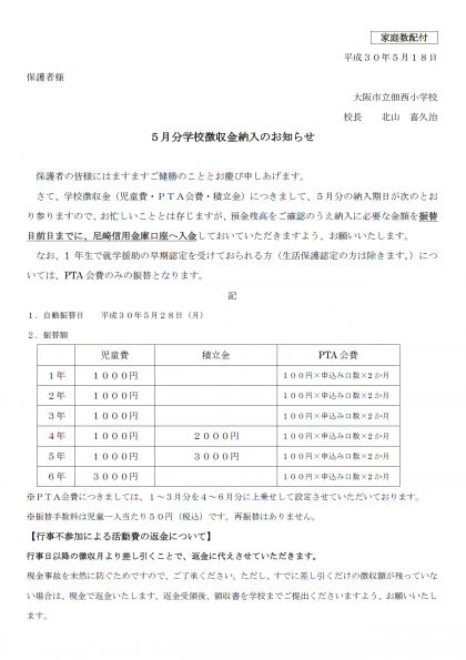 18日に、お子さまを通じて「5月分学校徴収金納入のお知らせ」を保護者の皆さまあて...