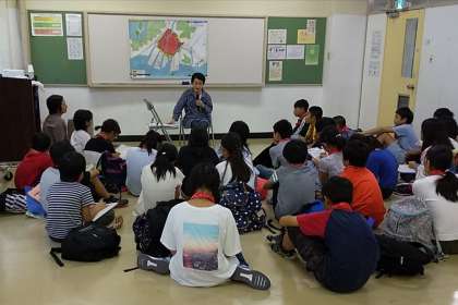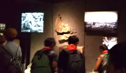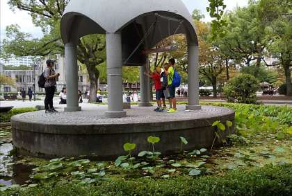平和資料館へ移動して管内の見学を行いました。他の見学者も多く混んでいましたが、メモを取りながら、熱心に見学していました。館外に出て平和公園内の碑めぐりをしました。その後青少年センターに場所を移して被爆体験証言者の方からの聞き取りを行いました。クラスごとに聞き取りをしました。