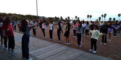 朝の集いです。朝の体操で眠けを吹き飛ばしました。
