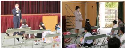 その後、講堂に入り、校長先生のお話や校歌紹介の後、担任の先生と挨拶をしました。子どもたちは、新しいランドセルを横に置き、ずっと真剣な表情でお話を聞いていました。