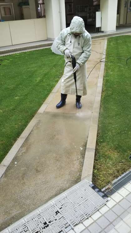 6月18日(木)、雨の中、管理作業員さんが中庭の芝生の歩道を高圧洗浄機で清掃されていました。