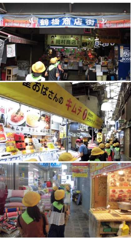 大阪市生野区にある「コリアタウン」へ社会見学に行きました。鶴橋駅を出ると「国際市場」があり、迷路のような細い通りには、韓国の食品や色とりどりの衣料品などのお店が並んでいました。