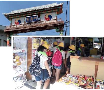 コリアタウンでは、お店の見学をしながら買い物体験をしました。子どもたちは500円の予算を考えながらいろいろなお土産を買い、とても楽しんでいました。商店街では、見たこともない食べ物を見つけたり、トマトやカニのキムチを見つけてキムチの種類の多さに驚いたりと発見の連続でした。半日の活動でしたが、韓国の文化にたくさん触れることができました。