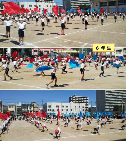 特に6年生のフラッグ「今こそ1つに」は、心を一つにした児童の真剣な演技が、見るものに感動を与えることができました。