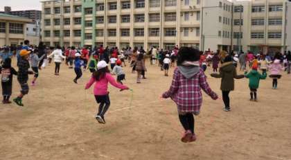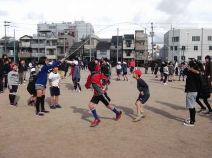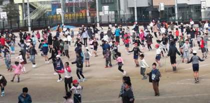 1月から2月にかけて毎週火曜日と水曜日の15分休憩に行っています。2時間目が終わると、全学年の児童が運動場に集合。短なわや長なわで、いろいろな技に挑戦します。たてわり班で集まって練習するので、高学年が見本になったり、長なわを回してあげたりと、学年をこえて楽しく練習しています。何回跳んだか競い合いながら、寒さも吹き飛ばしています。
