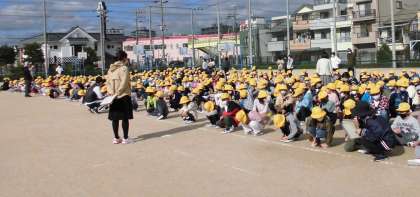 まず、地震警報の合図で運動場に避難。その後の津波警報の合図で、校舎の4階へ。全児童が真剣な表情で、速やかに無事避難することができました。