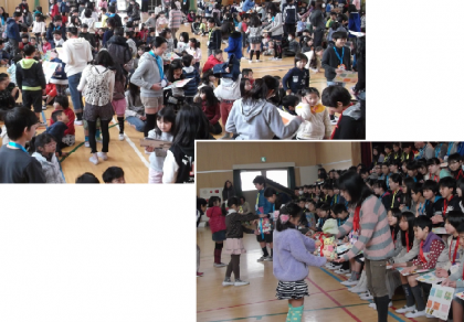 たてわりグループでクイズやゲームを楽しんだ後、各学年から6年生へ感謝をこめた呼びかけや歌・リコーダー奏のプレゼント。そして6年生からも手作りぞうきんのプレゼントと「ありがとうさようなら」の替え歌があり、少ししんみりとした雰囲気になりました。