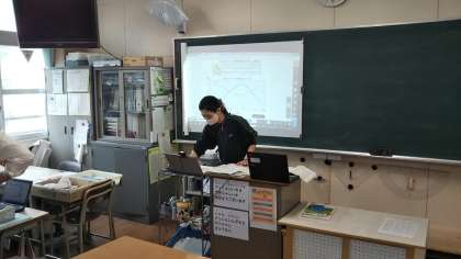 児童が家庭に持ち帰った一人一台端末と、学級担任が操作する教室のパソコンが繋がり、授業が進みました。