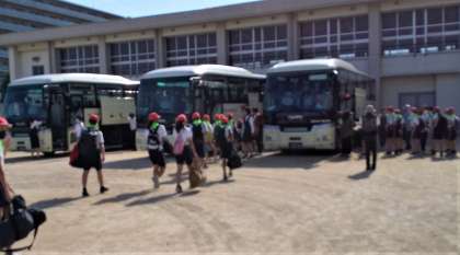 5年生の出発の後、6年生が出発式を行い、8時に元気よく出発しました。昨年度は実施できず、待ちに待った林間学習で、楽しい思い出話を持って帰ってくれることと思います。