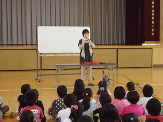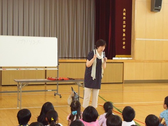 まず最初にいろいろなリコーダーを使って演奏してくださいました。みんなの使うソプラノ、少し長いアルト、もっと長いテナー、少し短いソプラニーノなど、たくさんのリコーダーを見せていただき、子どもたちは目をキラキラさせながら話を聞いていました。