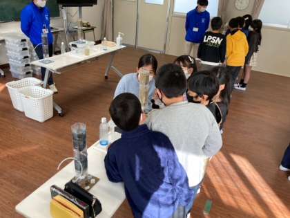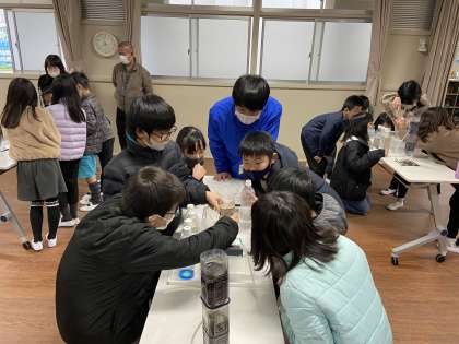 目でもわかる大きな砂が混じった茶色の水をろ過することで、透明な水に変わり、子どもたちもとてもびっくりしていました。とても楽しい学習ができました。これからも、水を大切にしていきましょうね!