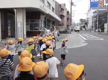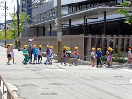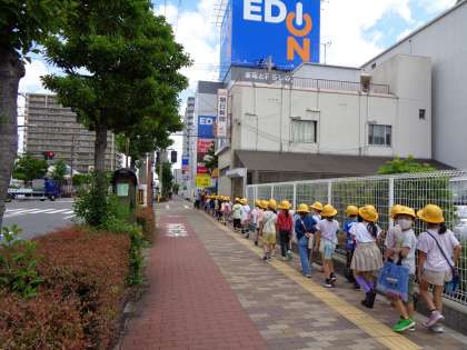 さわやかな青空の中、通学路たんけんに出かけました。登下校でいつも歩いている通学路ですが、交通標識や自転車と歩行者の専用道路などを確認しながら、安全に気を付けて歩きました。