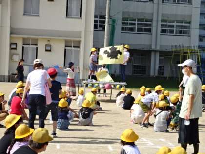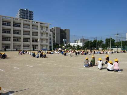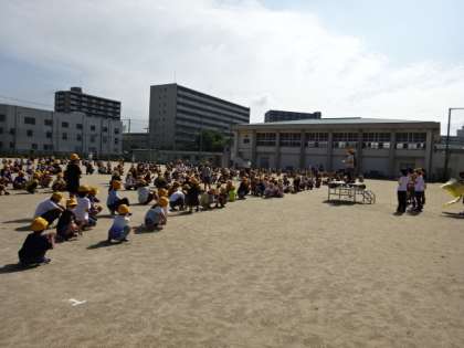 夏の陽射しが降り注ぐ中、朝の児童朝会で、縦割り活動を行いました。