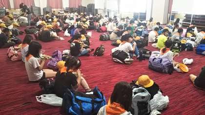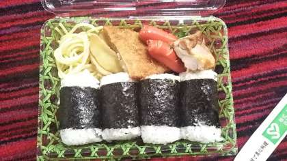 グリーン広場が、前日からの雨で濡れていたので、館内の多目的室にて、お昼ごはん、おにぎり弁当をいただきます。