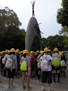 修学旅行に行く前に、佐々木禎子さんのお話を聞いた1年生から5年生は平和を願う寄せ書きを6年生に託しました。6年生は千羽鶴を作りました。それらを供えることで、平和への願いを新たにするとともに、平和の尊さを強く感じたようでした。
