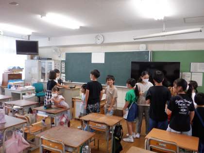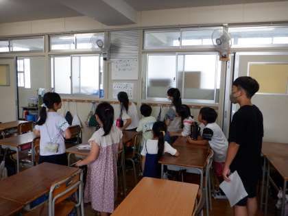 それぞれの場所に掲示しているクイズは子どもたちが考えたもので、難しいクイズもありました。班の友だちと協力し、一生懸命答えを考えていました。
