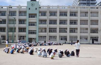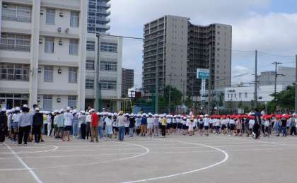 全校朝会の時間に、運動会に向けた全体練習をおこないました。