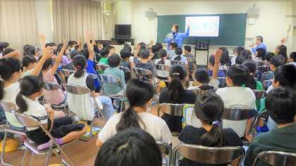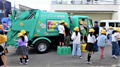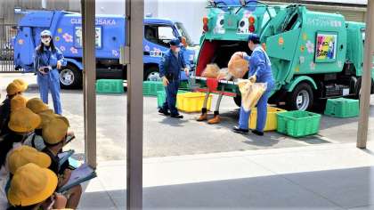大阪市の環境局の方がパッカー車の体験学習のために来てくださいました。パッカー車クイズと乗車体験を行いました。「パッカーくん」のごみの収集運搬作業の様子を間近見ることができ、その迫力に大喜びの子どもたちでした。更に、大阪市のごみの分別方法についての話も聞かせてもらい、充実した学習の時間となりました。