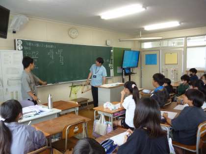 1組は、体育科で、集団行動や体つくり運動、ローテーションドッジボールを教えていただきました。2組は、数学科で、「分数を小数に!小数を分数に!」というめあてで、無限小数を分数になおすという学習をしました。