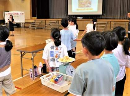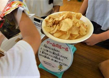カルビーの方をお招きして、出張授業の「スナックスクール」を行いました。ポテトチップスを使い、1日に食べるおやつの量を予想して秤にのせていきました。一日に食べられるおやつの量はポテトチップスだと35グラム分(両手にのる量)で、200キロカロリーが丁度良いそうです。グループによっては一袋全部を秤にのせ、「このくらい食べられる。」と話していたり、「少しでいい。」と話していたりと様々でした。