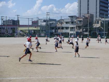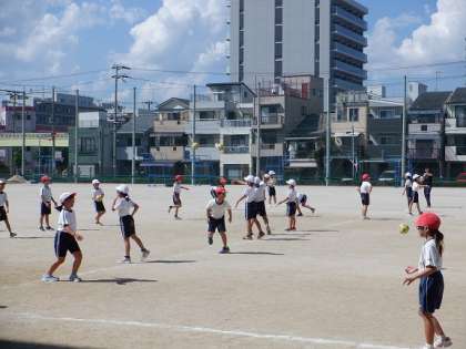 体育では、楽しみながらしっぽ取りをしたり、キャッチボールをしたりしていました。