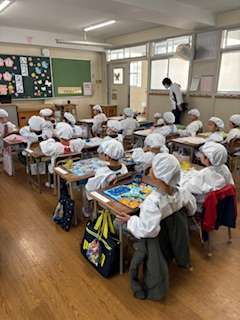 今日から給食が始まります。1年生にとっては初めての給食です。エプロン、帽子、マスクの付け方、片付け方を学習しました。一つずつが学びです。