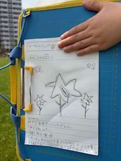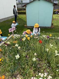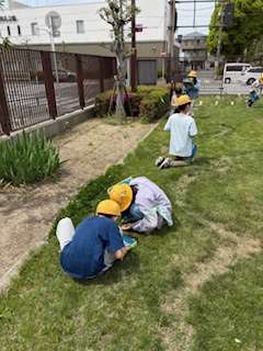 学習園の観察に来ました。ワークシートにスケッチして気づいたことをメモします。見た目、触ってみると『葉っぱはざらざらやった』『花びらはツルツルや』など特徴を発見しました。