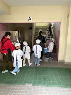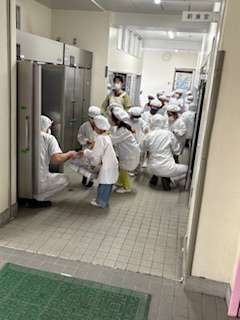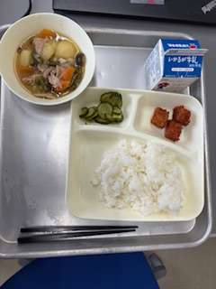 一年生にとっては少し重たい食器や牛乳ですが友だちと協力して教室まで運びます。