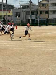 運動会に向けてリレーの学習です。チームワークを高めるためにバトンパスは走ってくる相手を見ずに進行方向を見て後ろに腕を伸ばしバトンを受け取ります。バトンパスがスムーズになるとスピードもアップしますね。