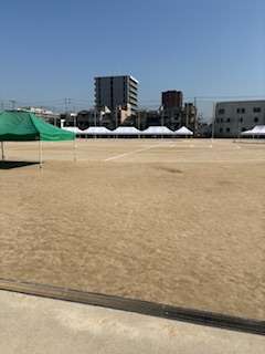 運動会に向けて運動場にテントが並びました。昨日の放課後、教職員で協力してたてました。