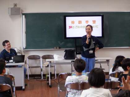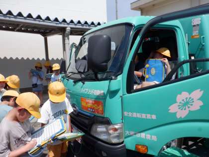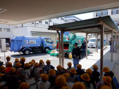大阪市環境局の方がパッカー車の体験学習のために来てくださいました。パッカー車クイズと乗車体験を行いました。「パッカーくん」のごみ収集運搬作業の様子を間近で見ることができ、その迫力に大喜びの子どもたちでした。後半は、多目的室でごみの分別方法やフードロスについての話を聞きました。環境について考えることができました。